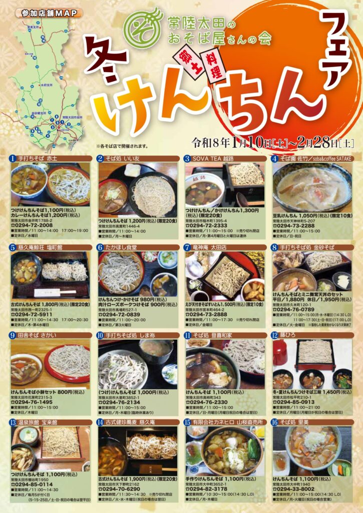 常陸太田のおそば屋さんの会では各店趣向を凝らした「けんちん」と常陸太田市が発祥の地として知られている「常陸秋そば」を使ったメニューを提供します!